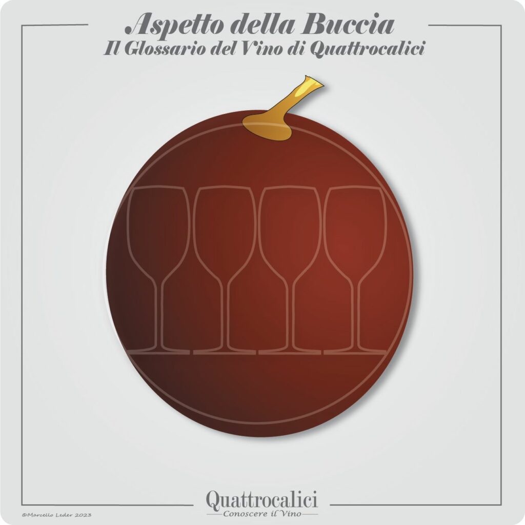 La buccia degli acini viene descritta in ampelografia prendendo in considerazione diversi aspetti della sua morfologia. A parte il colore, che viene descritto in un’altra sezione del glossario, per quanto riguarda l’aspetto della buccia degli acini si prende in considerazione la presenza maggiore o minore di pruina, la presenza di puntinatura o macchie, la presenza o meno dell’ombelico all’estremità opposta dell’acino rispetto al peduncolo. Della buccia si prende anche in considerazione il suo spessore e la sua consistenza, importanti anche per determinare la predisposizione o meno del vitigno all’appassimento.