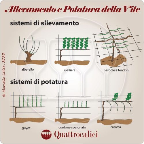 I sistemi di allevamento della vite si riferiscono alle geometrie dei filari e alle diverse strutture fisiche e configurazioni utilizzate per sostenere e guidare la crescita delle viti. Questi sistemi includono tralicci, pergole, filari e altri tipi di supporti e tutori che permettono alle viti di crescere in modo organizzato e facilitano le operazioni agricole come la potatura, la raccolta e la gestione delle malattie. I sistemi di allevamento influenzano anche l’esposizione delle viti alla luce solare e all’aria, fattori che possono influire sulla maturazione del frutto e sulla qualità dell’uva. I sistemi di allevamento vanno dalle forme libere senza tutori come l’alberello, alle antiche alberate (viti “maritate” con tutori vivi, come gli olmi), alle tradizionali pergole e tendoni fino alle più moderne forme a spalliera, che includono il Guyot, il cordone speronato, e molti altri.