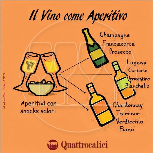 Anche un semplice aperitivo puรฒ diventare l’occasione per degustare un buon vino. Il rischio รจ che se si eccede nell’assunzione di alcol, anche e soprattutto se accompagnato da stuzzichini, si arriva facilmente a raddoppiare le calorie ingerite col successivo pasto e a renderne piรน difficile la digestione. Un buon vino, sia un bianco secco, che uno spumante rinfrescante, puรฒ quindi essere l’alternativa ideale quando parliamo di aperitivo.