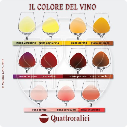 Ciascuno dei tre colori base dei vini ha diverse sfumature, che dipendono da vari fattori, tra i quali: caratteristiche del vitigno, durata della macerazione, processo di vinificazione, etร  del vino, etc.