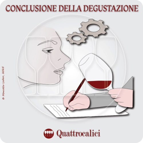 La conclusione della degustazioneย consiste nel fare le valutazioni conclusive sul vino in esame, e prendere nota di tutte le queste osservazioni in una dettagliata scheda di degustazione. Tali valutazioni conclusive sul vino riguardano gli aspetti non prettamente sensoriali che emergono dalla degustazione, ma che sono di importanza fondamentale per esprimere un giudizio conclusivo sul vino in esame.