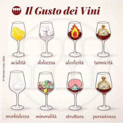Ma cosa si intende di preciso come “gusto di un vino“? Il linguaggio comune ci ha abituati a confondere, nella terminologia comune, i gusti con gli aromi e i profumi. Le sensazioni che vengono registrate a livello papillare (sensazioni saporifere) sono le seguenti: