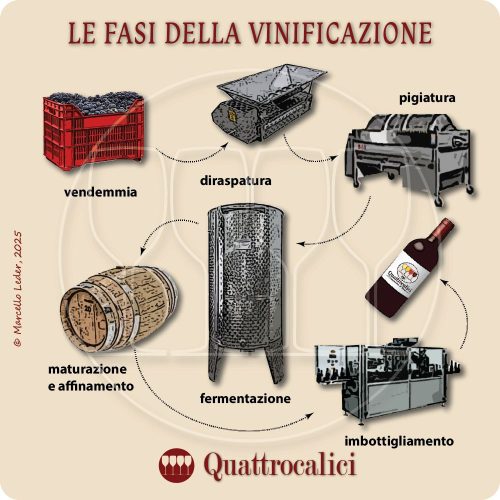 Il processo di vinificazione delle uve puรฒ venir suddiviso in fasi successive, che si susseguono nell’ordine. Ciascuna di queste fasi comporta delle scelte da parte del viticoltore o dell’enologo, che variano in funzione della materia prima (l’uva vendemmiata) e del prodotto che si desidera ottenere. Vediamole nel dettaglio.