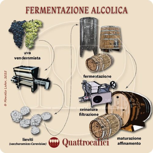 Durante la fermentazione alcolica gli zuccheri contenuto nel mostoย vengono convertiti dai lieviti in alcol etilico e anidride carbonica. I lieviti sonoย microorganismi unicellulari che utilizzano gli zuccheri presenti nel mosto per crescere e moltiplicarsi. Nelle fasi iniziali di questo processo cheย che si sviluppa in oltre trenta reazioni successiveย i lieviti svolgono una respirazione aerobiotica, si servono cioรจ dell’ossigeno presente nel mosto per trasformare gli zuccheri in acqua e anidride carbonica. Presto il poco ossigeno presente nel mosto si esaurisce ed รจ a questo punto, in condizioni anaerobiche, che inizia la fermentazione vera e propria. In questa fase i lieviti provocano l’ossidazione degli zuccheri e la loro trasformazione. A seconda del lievito utilizzatoย circa il 50% dello zucchero si trasforma in alcol, il 45% in anidride carbonica, il 3% in glicerolo e il 2% in altre sostanze di diversa natura che svolgono come giร accennato un ruolo essenziale nel determinare le qualitร aromatiche e gustative del vino. I sottoprodotti piรน importanti che meritano una menzione sono l’acetaldeide, l’acido acetico (responsabile dell’aciditร “volatile), l’acetato d’etile, il glicerolo e altri tipi di alcoli polivalenti che determinano tra le altre cose la morbidezza del gusto del vino.