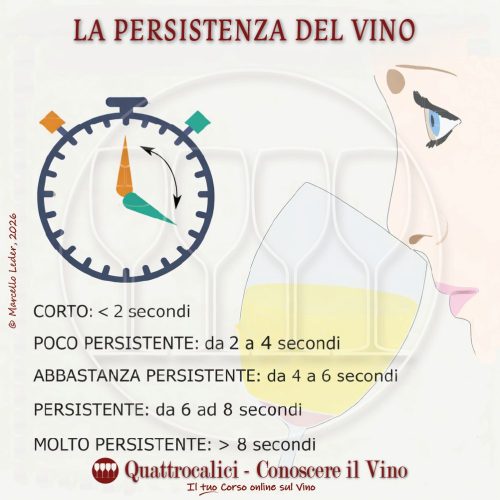 E’ questo l’effetto della maggiore o minore persistenza del vino. Dovendo indicarne un’unitร di misura per la persistenza, potremmo prendere un’unitร di tempo (secondi o minuti). In realtร questo si fa solo raramente e si preferisce definire il vino “corto” o “lungo“, intendendo la mancanza o l’elevata persistenza del vino. Nei casi intermedi definiremo il vino semplicemente poco o molto “persistente”. La scala di persistenza dei vini รจ pertanto la seguente: