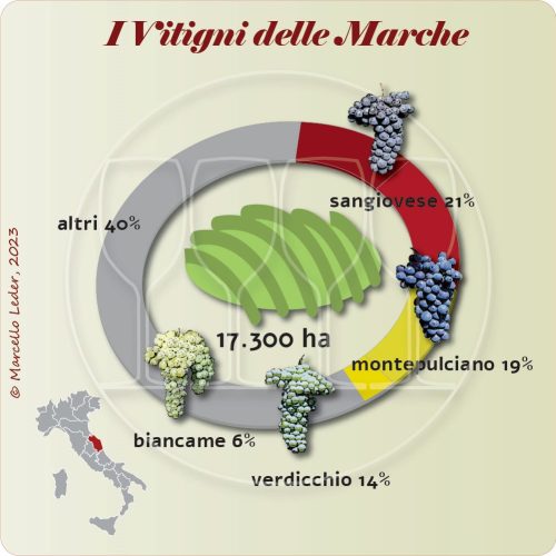 Le Marche hanno 17.300 ettari vitati, per una produzione di circa 1 milione di ettolitri di vino, il 45% bianco, per lโ€™altra parte rosso e rosato. I vigneti sono per lโ€™85% in collina, per il 5% in montagna e il 10% in pianura. I vini sono DOP per il 39% e IGP per il 24%. I vitigni sono soprattutto autoctoni e locali, come il Montepulciano, il Sangiovese e il Verdicchio.