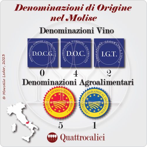 Con due sole province, Isernia e Campobasso, e una superficie vitata di circa 5.000 ha, il Molise รจ la terza piรน piccola regione vinicola dโItalia. La storia ha pesantemente influito sulla viticoltura del Molise, le cui caratteristiche riflettono quelle delle regioni confinanti. La provincia di Campobasso, posta a nord-est, copre i 2/3 della superficie regionale, si affaccia sul mare e racchiude i territori collinari piรน vocati alla viticoltura, che contribuiscono per quasi il 90% della produzione di vino della regione. La provincia di Isernia ha invece un territorio molto piรน piccolo e quasi interamente montuoso, ed una sola denominazione, la Pentro dโIserna DOC, con due tipologie di vino bianco, Trebbiano toscano e Bombino bianco, e due di vino rosso, Montepulciano e Tintilia. In provincia di Campobasso troviamo invece la DOC Biferno, con le tipologie Aglianico, Montepulciano e Trebbiano toscano. La DOC Molise copre tutte le zone vinicole della regione, con uno spettro piรน ampio di tipologie, sempre tutte varietali, che rappresentano tutti i vitigni coltivati in regione, a bacca bianca e nera, nazionali e internazionali. La DOC Tintilia del Molise, creata nel 2011, include tre tipologie di vino, tutte da Tintilia in purezza, una base, una riserva e una versione rosata. Due IGT di ricaduta fanno riferimento alle due province, la Rotae per Isernia e la Terra degli Osci per Campobasso.