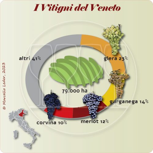 La distribuzione dei vitigni autoctoni riflette quella delle principali zone vinicole del Veneto. Sulle Colline del Garda e in Valpolicella i vitigni piรน importanti sono la Corvina, Rondinella e Molilnara, da cui si ottengono i vini di Bardolino e della stessa Valpolicella. Incuneata tra il Lago di Garda e le province di Verona e Mantova, la zona del Lugana vede il suo caratteristico vino bianco prodotto con il vitigno Trebbiano di Soave, localmente noto anche come Turbiana, o Trebbiano di Lugana. Tra le province di Verona e Vicenza troviamo i comprensori di Soave e di Gambellara, i cui vini bianchi si producono a partire dalle uve del vitigno Garganega. I Colli Berici, si trovano immediatamente a sud di Vicenza. Qui si producono vini rossi a base dei vitigni internazionali Cabernet Sauvignon, e Merlot, oltre allโautoctono Tocai Rosso, un vitignoย che presenta affinitร col Cannonau, ma soprattutto con la Grenache, coltivata in Provenza. La zona pedemontana del Vicentino, posta invece a nord della cittร , oltre che per i rossi, รจ conosciuta per il vitigno autoctono Vespaiola e per il vino passito che se ne ricava, il famoso Torcolato di Breganze. Nel Padovano, sui Colli Euganei, sono coltivati soprattutto vitigni internazionali a bacca nera, ma soprattutto il Moscato giallo, da cui si produce il Moscato Fior dโArancio DOCG. Nella zona pianeggiante a sud del capoluogo viene coltivato il vitigno Friularo, un clone locale dell Raboso Piave, che a sua volta รจ caratteristico della provincia di Treviso. Nel Trevigiano, sui Colli di Asolo e di Valdobbiadene, รจ situata anche la zona vinicola originaria del Prosecco, prodotto con il vitigno oggi chiamato Glera. Il Prosecco viene oggi prodotto in tutto il Veneto, oltre che nel Friuli-Venezia Giulia, in un territorio che rappresenta ormai il piรน importante importante distretto spumantistico Italiano, che arriva ad abbracciare quasi tutto il Triveneto.
