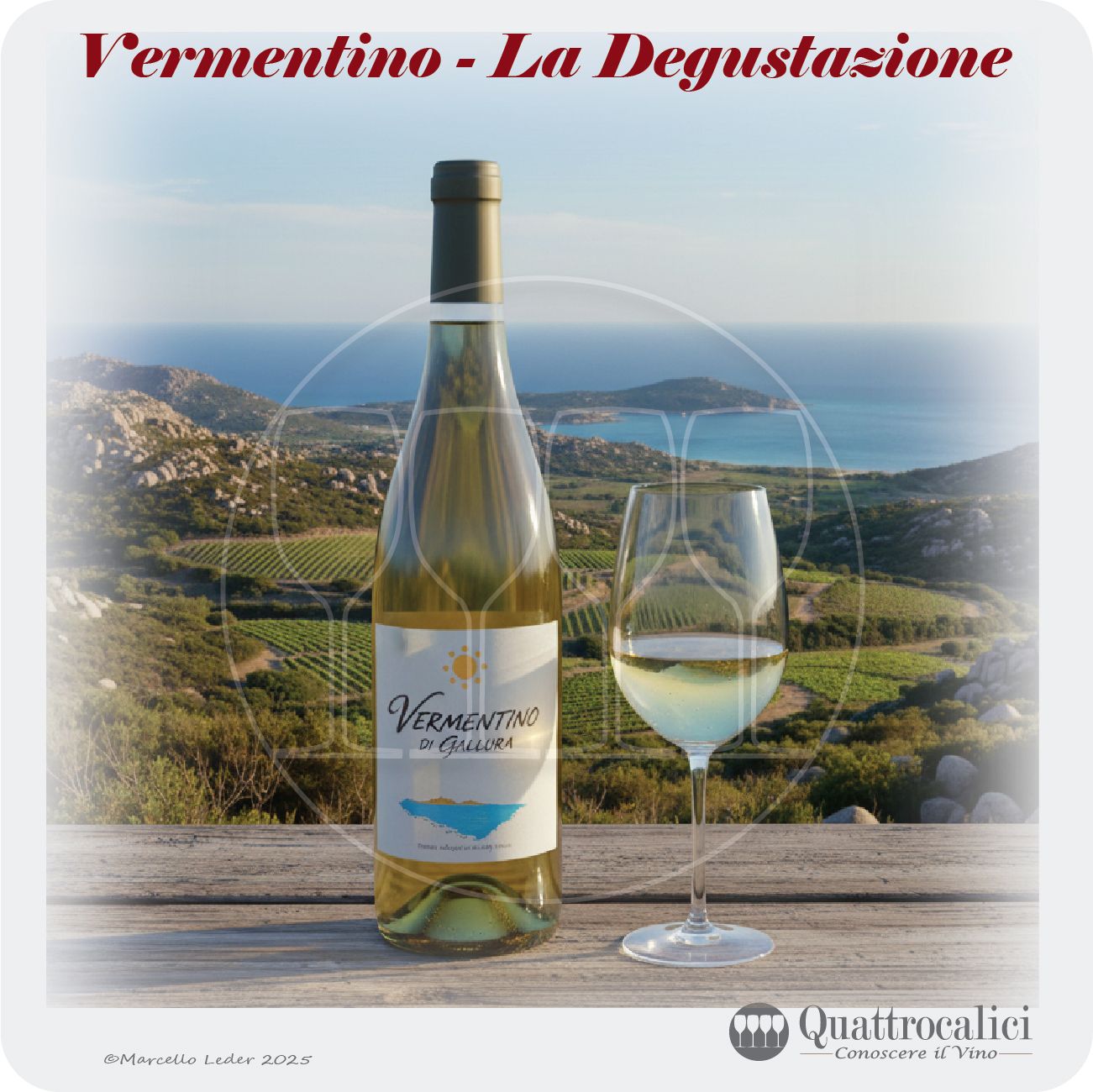Nel calice il Vermentino si presenta con un colore giallo paglierino brillante, a volte con riflessi verdolini. Al naso rivela un bouquet ricco e caratteristico, con sentori di fiori bianchi, erbe aromatiche mediterranee (salvia, rosmarino, timo), agrumi, mela verde, pesca bianca e mandorla fresca, accompagnati da una tipica vena minerale e marina. Al palato è secco, fresco, con acidità equilibrata, struttura medio-leggera e un finale sapido e amarognolo, che richiama la mandorla e ne rappresenta un tratto distintivo.