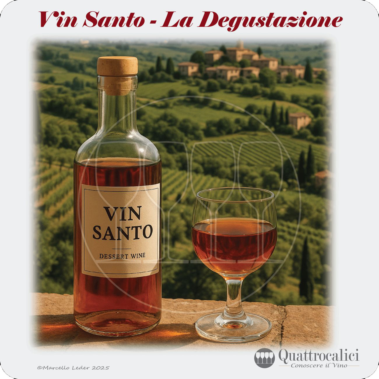 La degustazione del Vin Santo. Il Vin Santo è un vino dolce prodotto da uve passite, cioè con grappoli raccolti generalmente surmaturi, che vengono lasciati per molte settimane sui graticci o appesi, perché si disidratino e concentrino gli zuccheri. La perdita in acqua arriva al del 50% o più, amplificando dolcezza e concentrazione dei mosti. L’appassimento dura almeno 2 mesi, ma in alcuni casi si arriva anche a 6 mesi abbondanti. Si tratta dello stesso sistema usato per produrre tutti i grandi vini dolci del mondo, tra cui Sauternes, Recioto, Tokaji, Picolit, ma nel caso del Vin Santo le uve non vengono mai lasciate attaccare dalla “muffa nobile“. Il Vin Santo è un vino tipico della Toscana, ma lo si può trovare anche in altre regioni, dalle Marche all’Umbria, all’Emilia, fino al Veneto, con caratteristiche che si assomigliano, ma sempre con differenze locali, sia in termini di vitigni impiegati che del metodo produttivo. Il Vin Santo viene fatto maturare in piccole botti di legno di capacità variabile, chiamate in Toscana caratelli. I vari disciplinari regolano anche la capacità delle botti usate per la maturazione, che variano da un massimo di 5 ettolitri per i vini meno pregiati, fino ai 125 litri delle riserve. Anche la durata dell’affinamento dipende dai disciplinari. Nel Chianti, questo affinamento dura minimo 36 mesi e 48 per la Riserva e l’Occhio di Pernice. A Montepulciano sono 36 mesi per il Vin Santo base, 60 per la Riserva e 96 mesi per l’Occhio di Pernice. Le botti vengono messe a riposare sotto i tetti o comunque in zone esposte alle escursioni termiche stagionali, in modo che l’alternanza del caldo e del freddo caratterizzi i vini con delicate e particolari note ossidative, in un processo di maturazione che ricorda quello dell’Aceto balsamico tradizionale di Modena e Reggio Emilia. Per produrre il Vin Santo, in Toscana si usano i vitigni Trebbiano Toscano, Malvasia Bianca e Grechetto, per il Vin Santo Occhio di Pernice, Sangiovese e altri vitigni a bacca nera ma anche bianca. Nelle altre regioni prevalgono i vitigni coltivati localmente.
