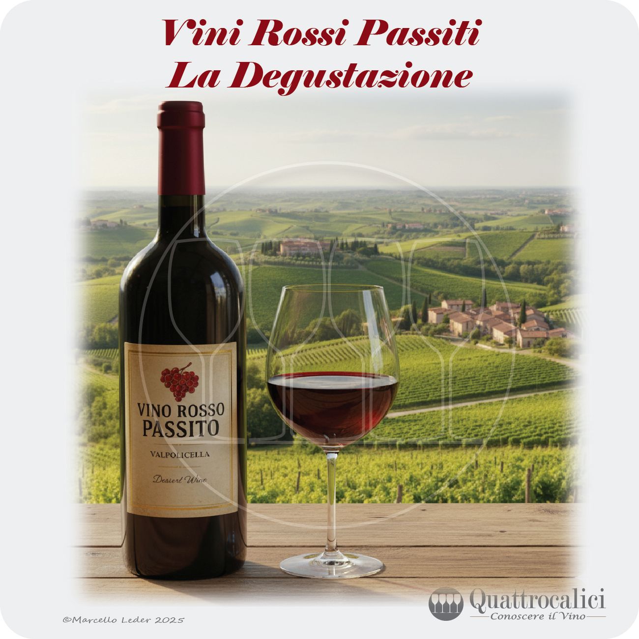 La degustazione dei vini rossi passiti. I vini rossi passiti sono prodotti mediante tecniche che consentono l’allontanamento di parte dell’acqua contenuta negli acini maturi. Tali tecniche, note appunto come appassimento, consentono di ridurre, e di conseguenza concentrare, il contenuto degli acini dal 30 al 50% in peso. L’appassimento può essere condotto in modi diversi. Lo si può fare direttamente sulla pianta, recidendo il peduncolo in modo da separare il grappolo e lasciandolo quindi sul posto fino al raggiungimento del livello di disidratazione voluto. Se si attende, clima permettendo, fino alla prima gelata invernale, se potranno ottenere gli ice-wines, nei quali parte dell’acqua contenuta negli acini si separa grazie al suo congelamento. Un’alternativa tradizionale è costituita dai cosiddetti graticci, o piani di legno o canna intrecciati, sui quali i grappoli vengono distesi ad appassire. Tali graticci spesso ricordano quelli utilizzati per la coltura dei bachi da seta, e in Valpolicella, terra del Recioto e dell’Amarone, vengono chiamati arèle. Altro sistema tradizionale, usato sempre nel Veneto, sono i cosiddetti picài, in dialetto letteralmente “appesi”, funi che pendono dal soffitto, poste solitamente sotto i tetti, alle quali i grappoli recisi vengono appesi ad appassire. Questi sistemi tradizionali, in caso di produzioni significative dal punto di vista quantitativo, sono oggi sempre più sostituiti da cassette in plastica poste in locali ventilati artificialmente ed in condizioni controllate, detti fruttai. Un’altra caratteristica delle uve passite è che in alcuni casi, sotto specifiche condizioni di umidità e ventilazione, gli acini possono venir attaccati dalla botrytis cinerea, muffa particolarmente aggressiva, in una sua forma meno virulenta, nota come muffa nobile. Ancora una volta, queste condizioni si possono realizzare o sulla pianta, in condizioni climatiche ideali, o artificialmente nei fruttai. La muffa nobile contribuisce alla disidratazione degli acini, arricchendo gli stessi di sostanze secondarie come esteri e polialcoli, che contribuiscono notevolmente al profilo sensoriale del vino passito che se ne ottiene.